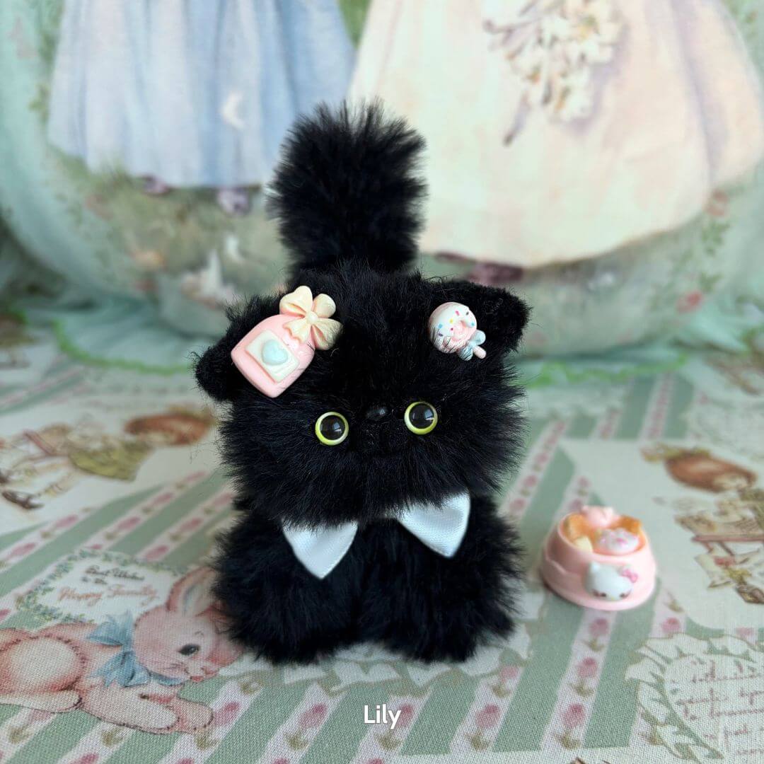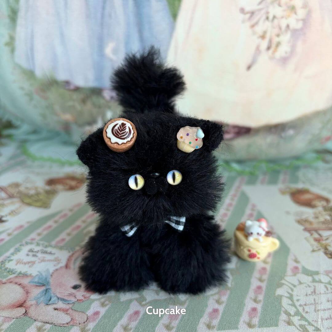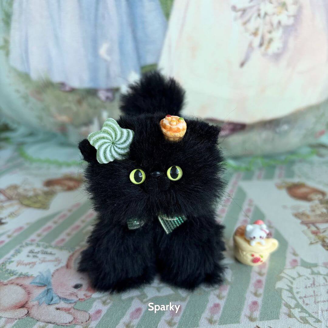 Meet the Black Kitten Collection – a group of one-of-a-kind handmade miniature cats, each with its own name, expression, and accessories. Sculpted by hand with soft faux fur and a flexible wire core, these tiny kittens are full of personality — from dreamy blue-eyed charmers to playful candy bow sweethearts.