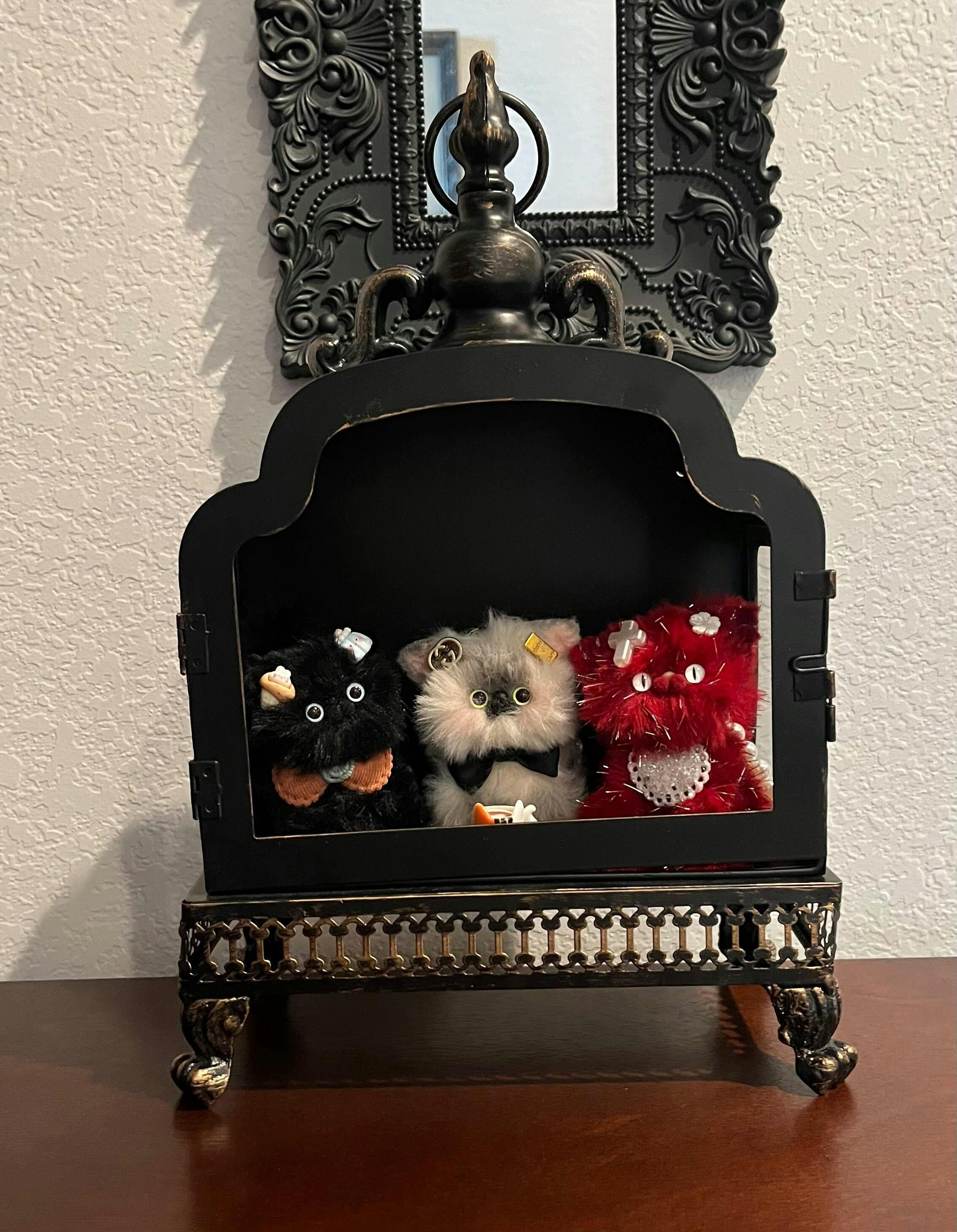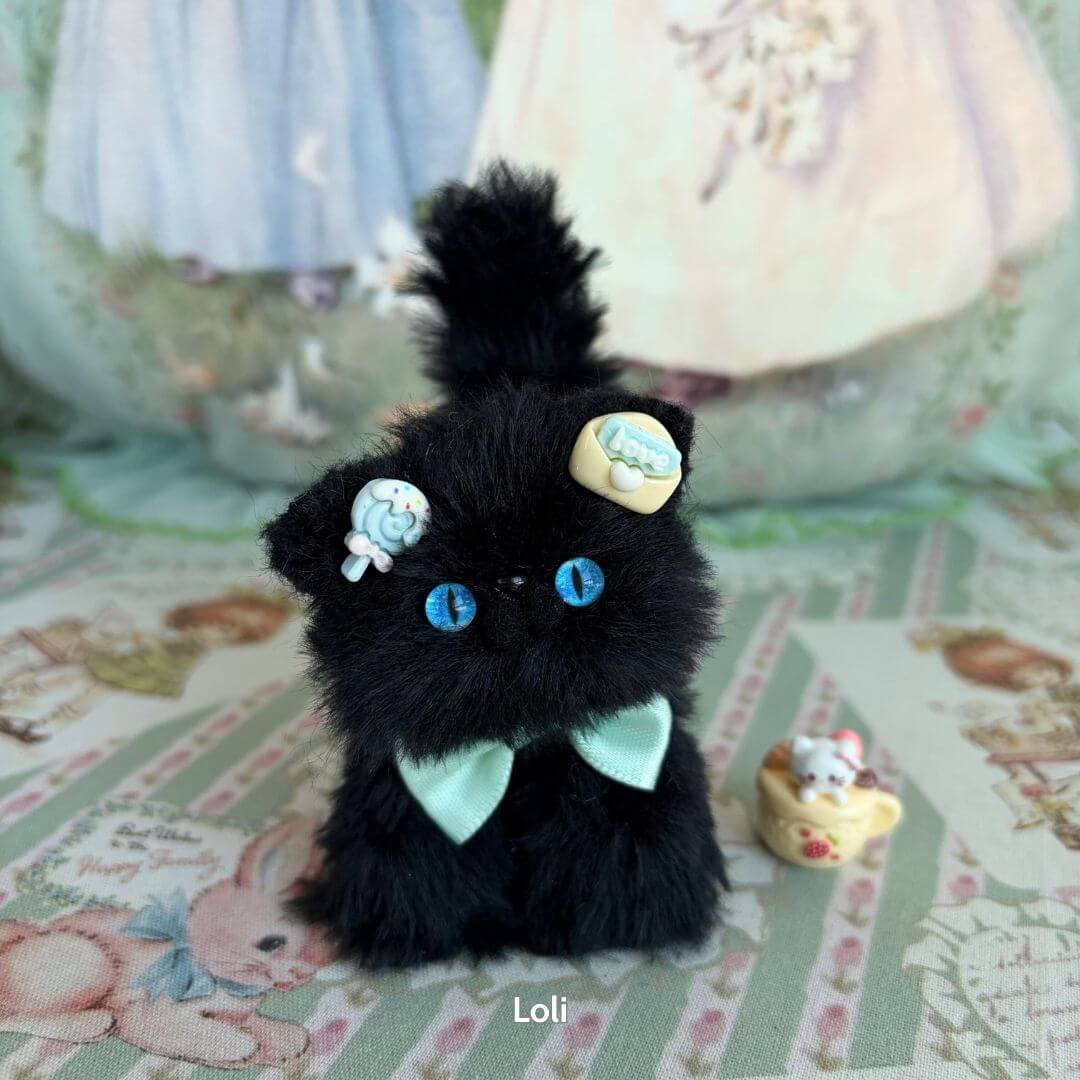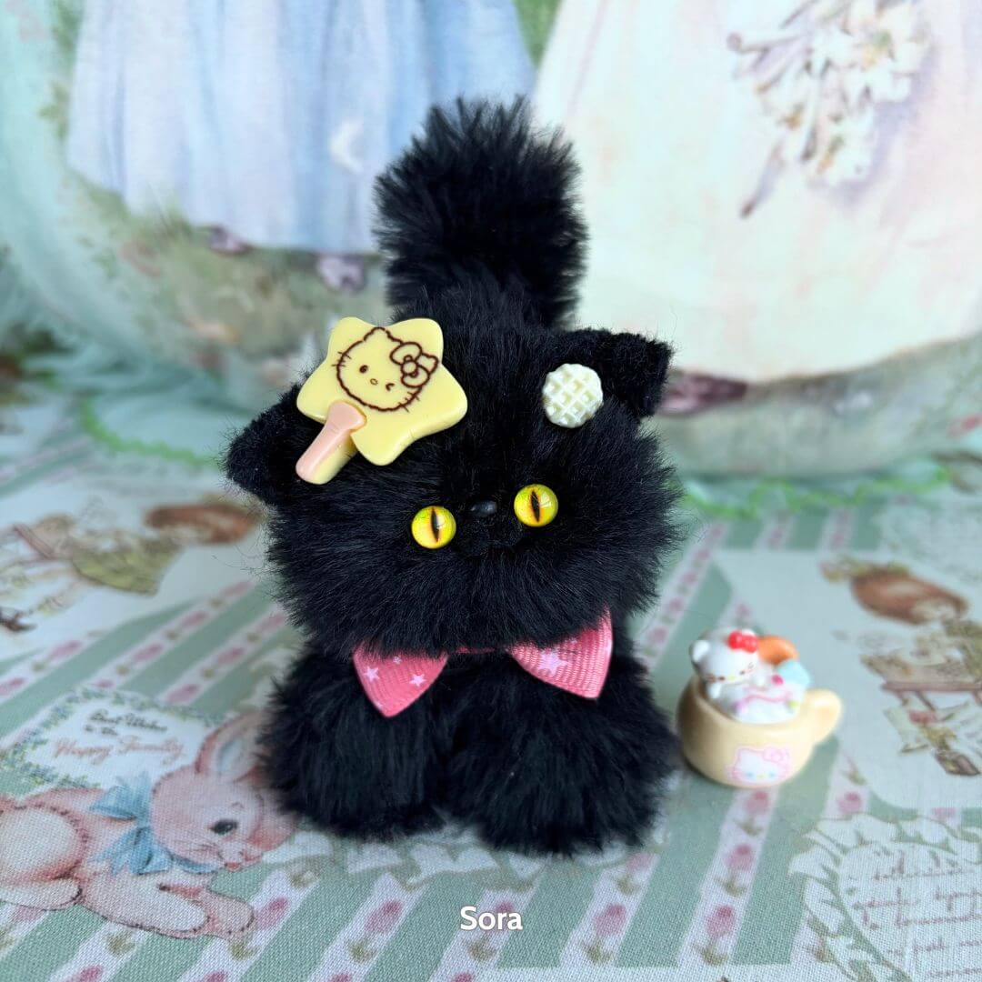 Meet the Black Kitten Collection – a group of one-of-a-kind handmade miniature cats, each with its own name, expression, and accessories. Sculpted by hand with soft faux fur and a flexible wire core, these tiny kittens are full of personality — from dreamy blue-eyed charmers to playful candy bow sweethearts.
