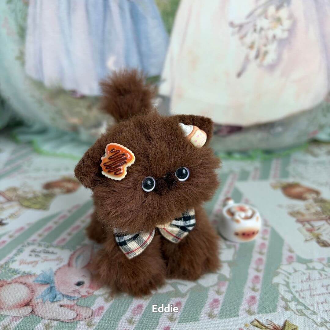 The Brown Kitten Collection features a family of handmade miniature kittens inspired by natural tabby and chocolate-toned cats. Each piece is crafted from soft faux fur and wire core for gentle poseability, then styled with a unique expression and dessert-themed accessory – like waffle clips, cookie bows, or a tiny whipped treat.
