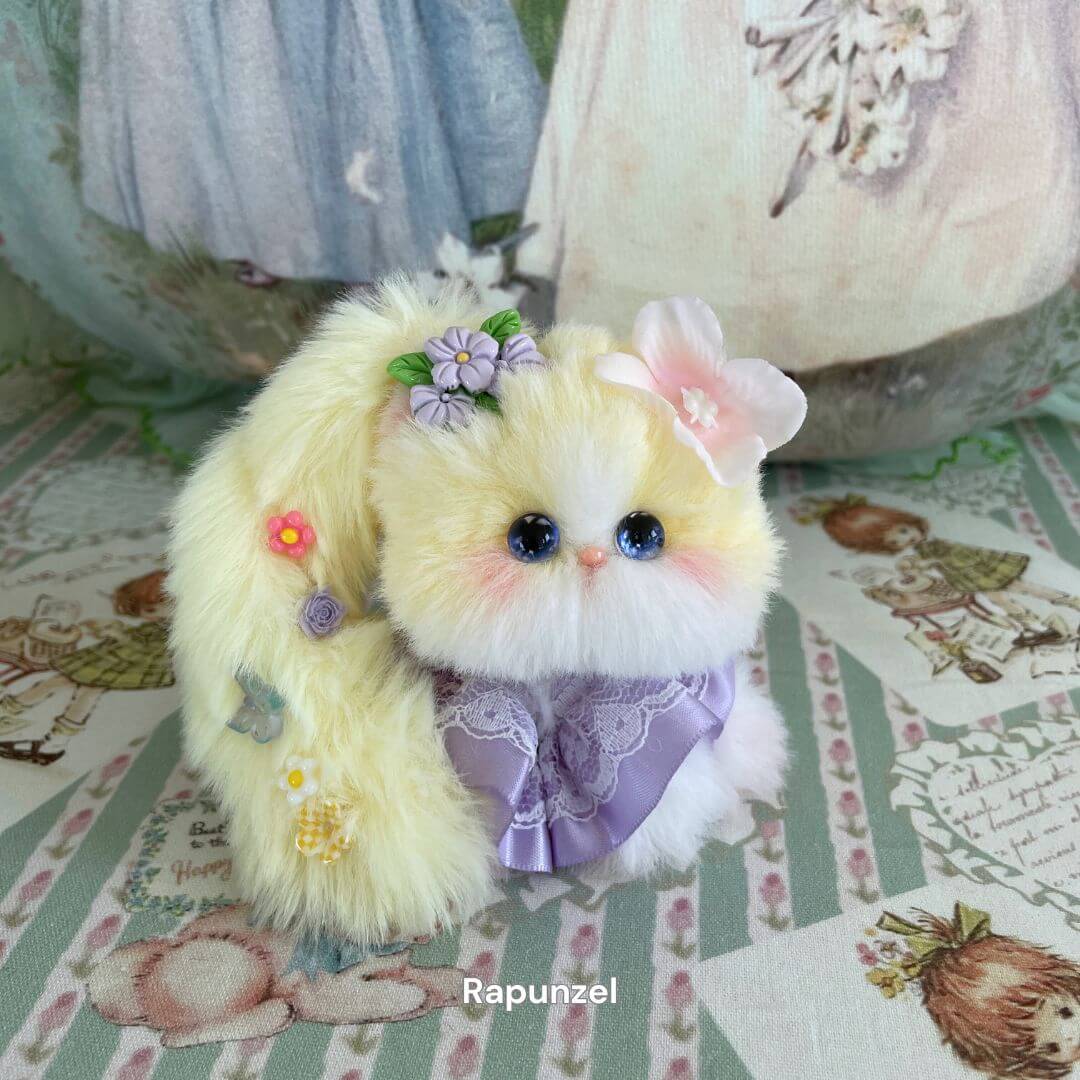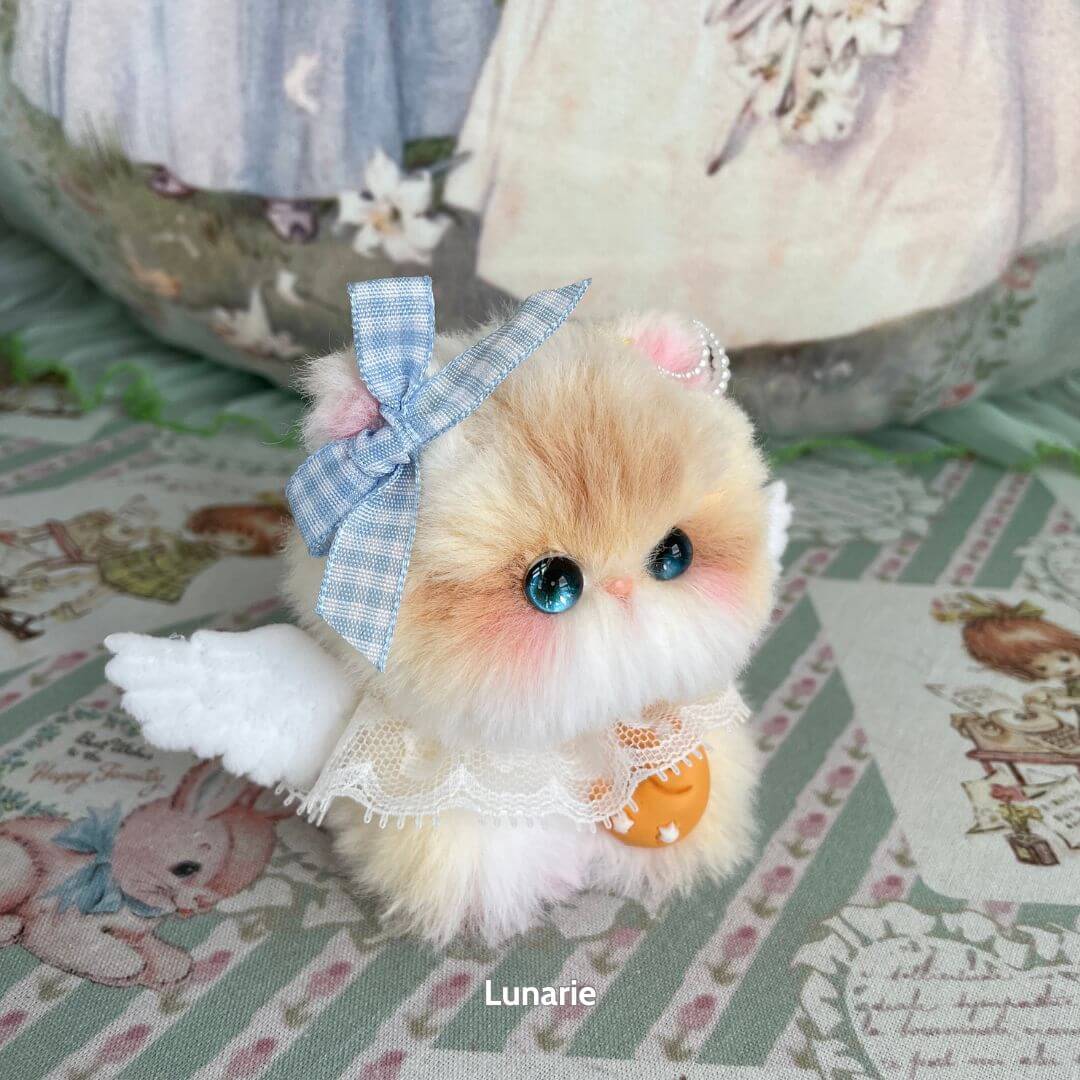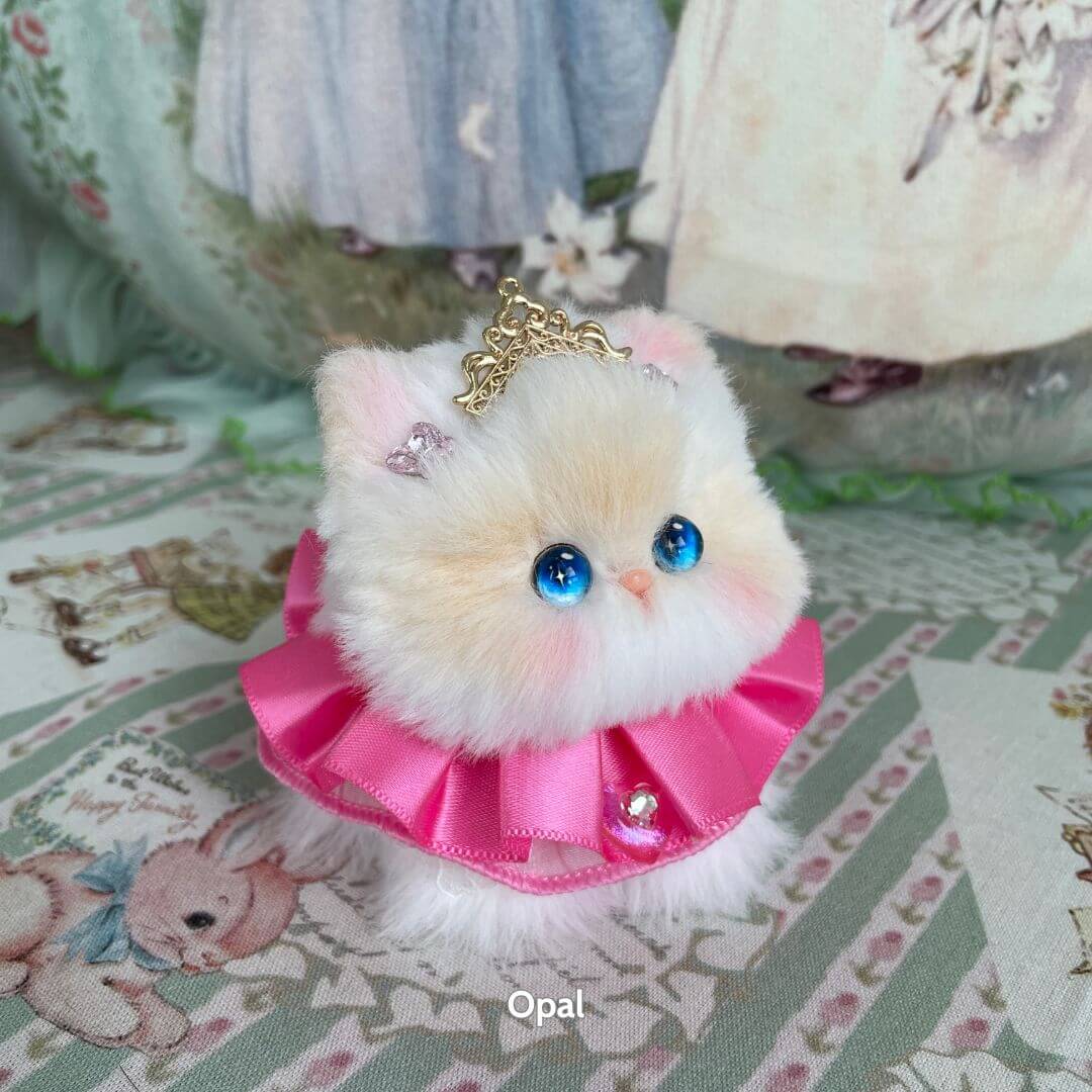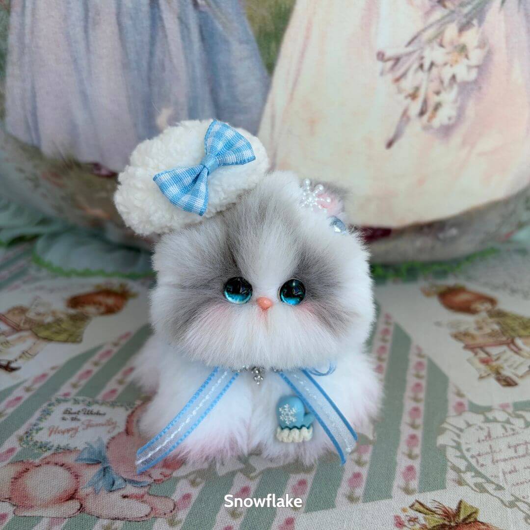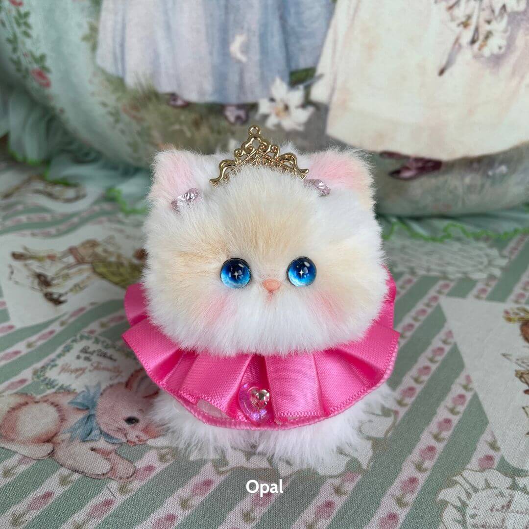 The Fairy Paws Collection is a gathering of kittens straight out of a magical meadow. Each one is handmade with soft faux fur, hand-painted blue eyes, and fairy tale accessories — from translucent wings and pearl collars to tiny spell bottles and star crowns.