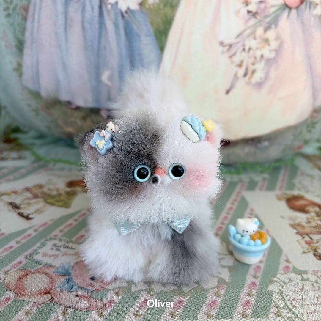 Each kitten is dressed in a unique colour palette: from realistic grey and caramel tones to pastel rainbows and magical purples. Decorated with bows, sweets, or roses, they are bursting with charm and character.