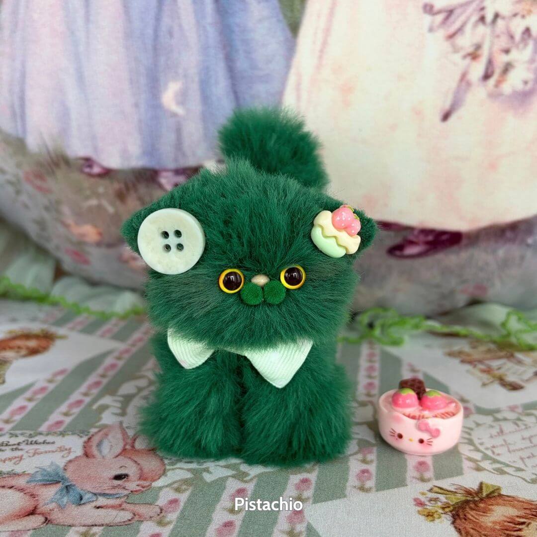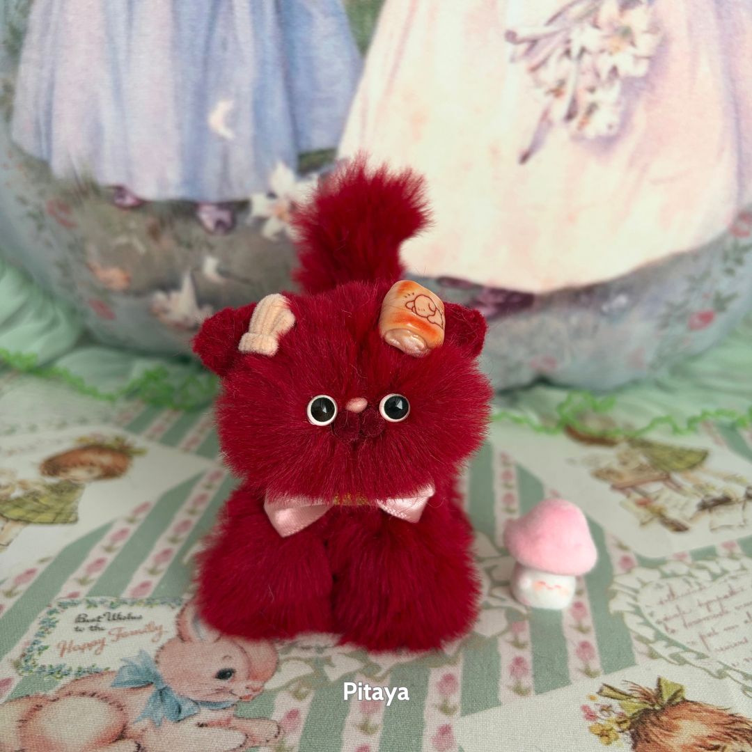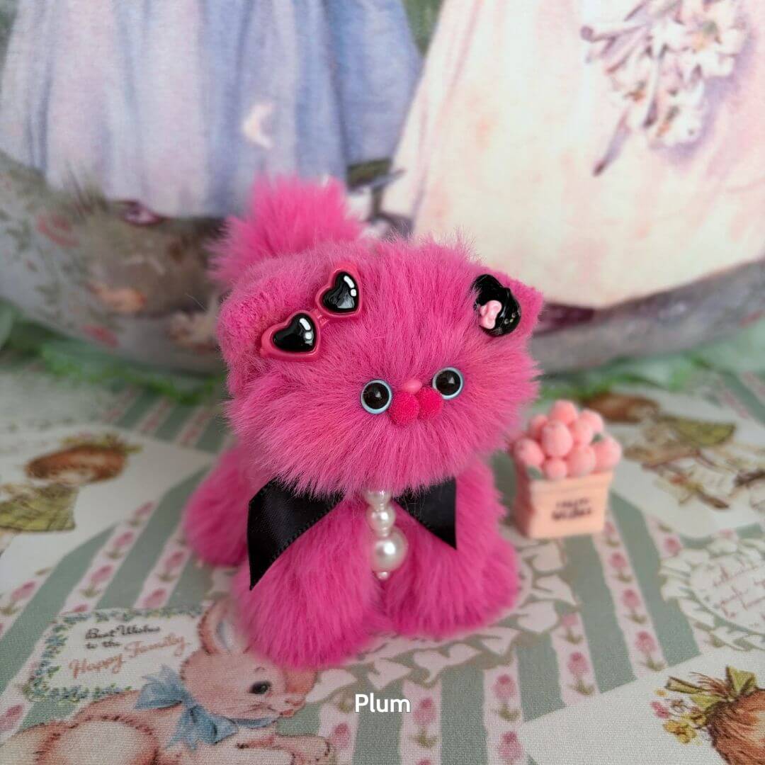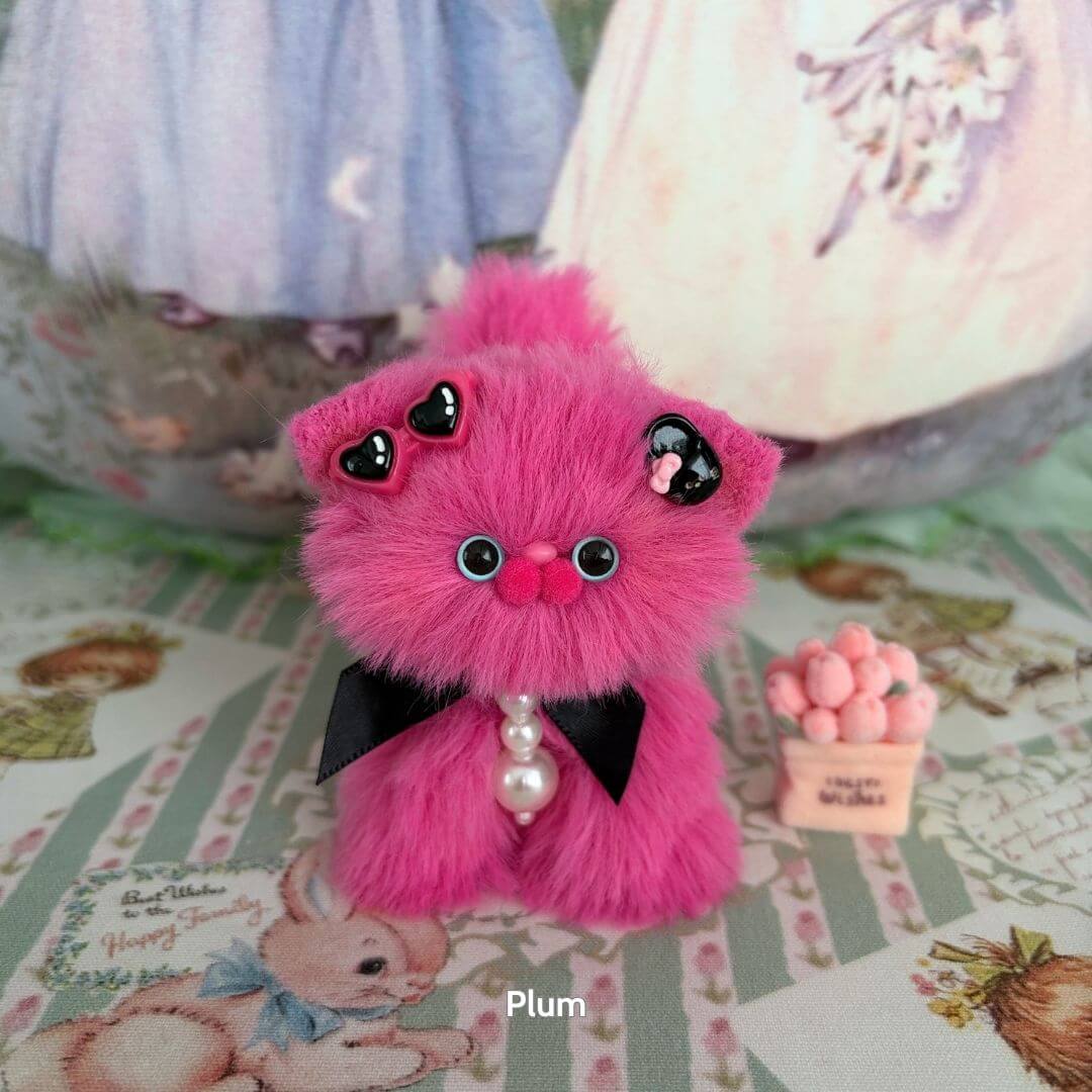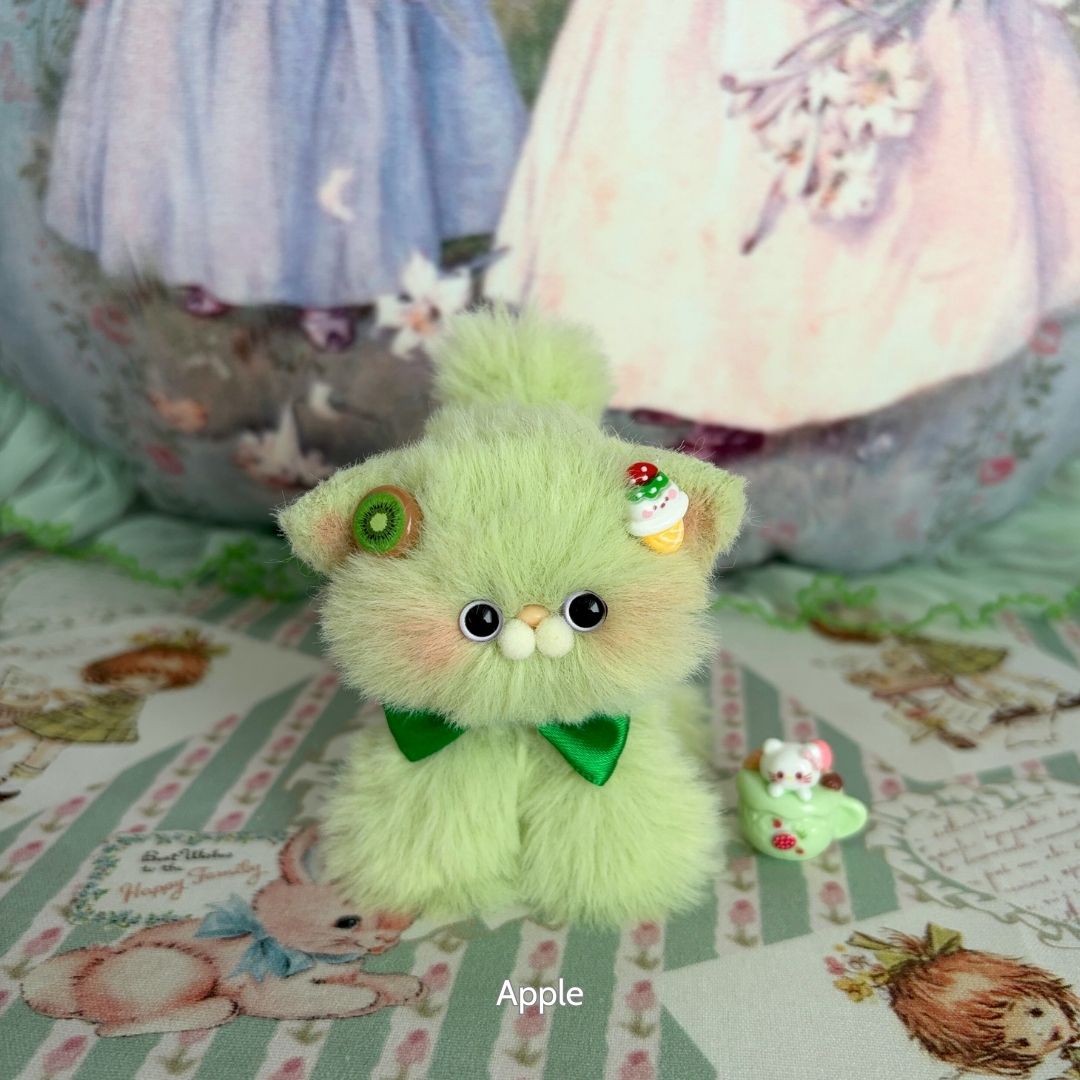 Handcrafted with soft faux fur and a flexible wire core, these tiny kittens wear matching bows and fruit-themed accessories like cherry hats, citrus cheeks, or whipped cream ears. Every kitten is one-of-a-kind, bursting with personality and perfect for gifting, collecting, or simply cheering up your desk.