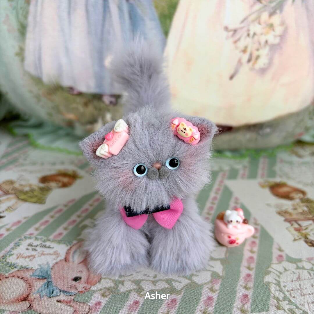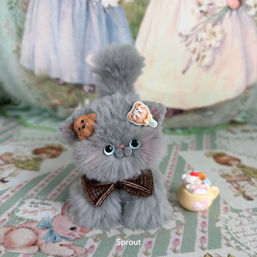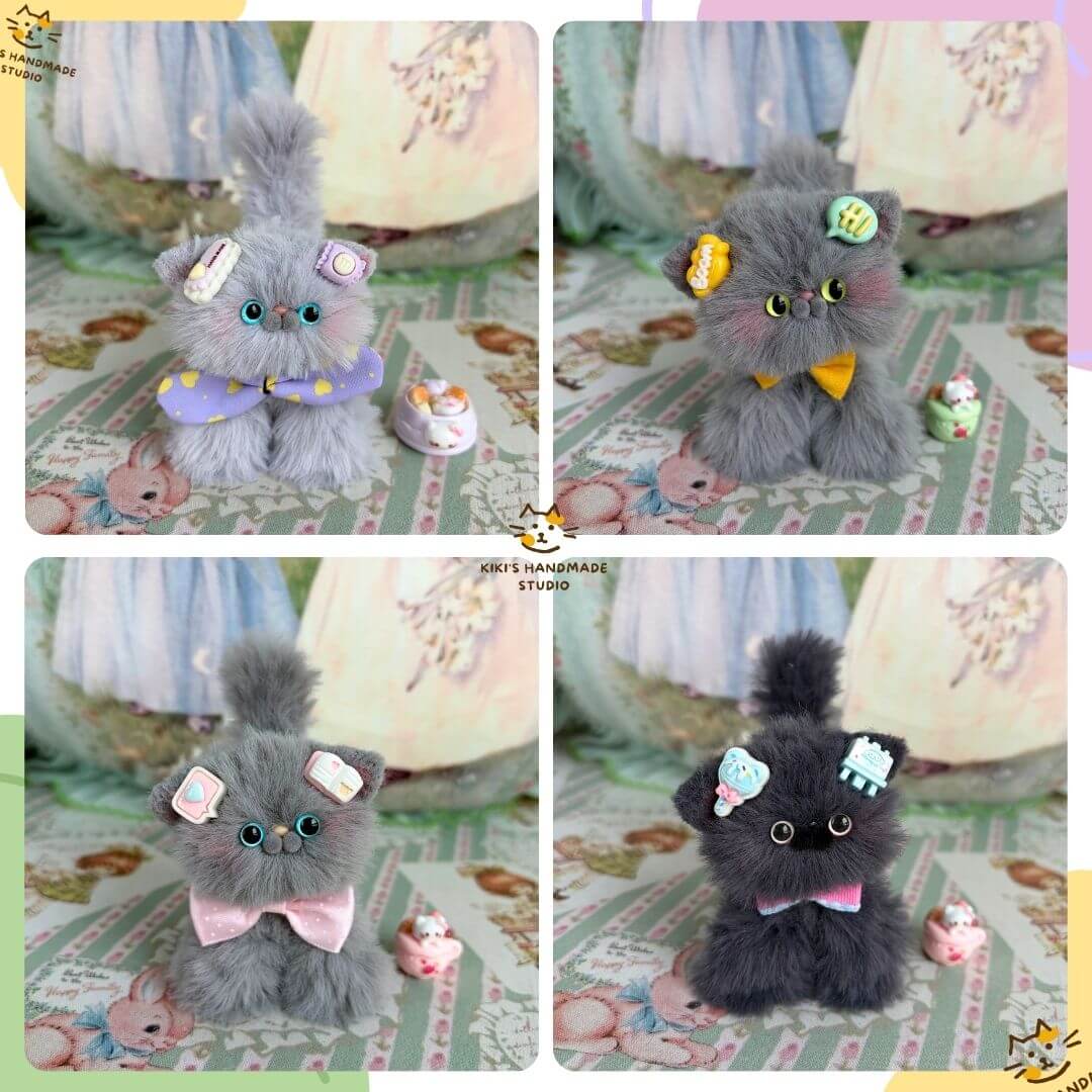 The Grey Kitten Collection celebrates the quiet magic of grey. From soft dove to stormy charcoal, each handmade kitten features a unique shade of grey faux fur — paired with whimsical accessories like strawberry berets, Halloween bows, candy hats or tiny cupcakes.