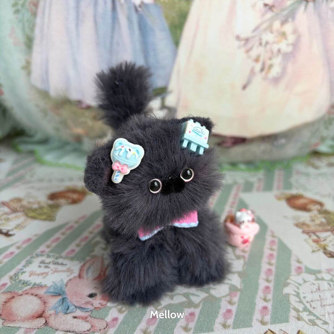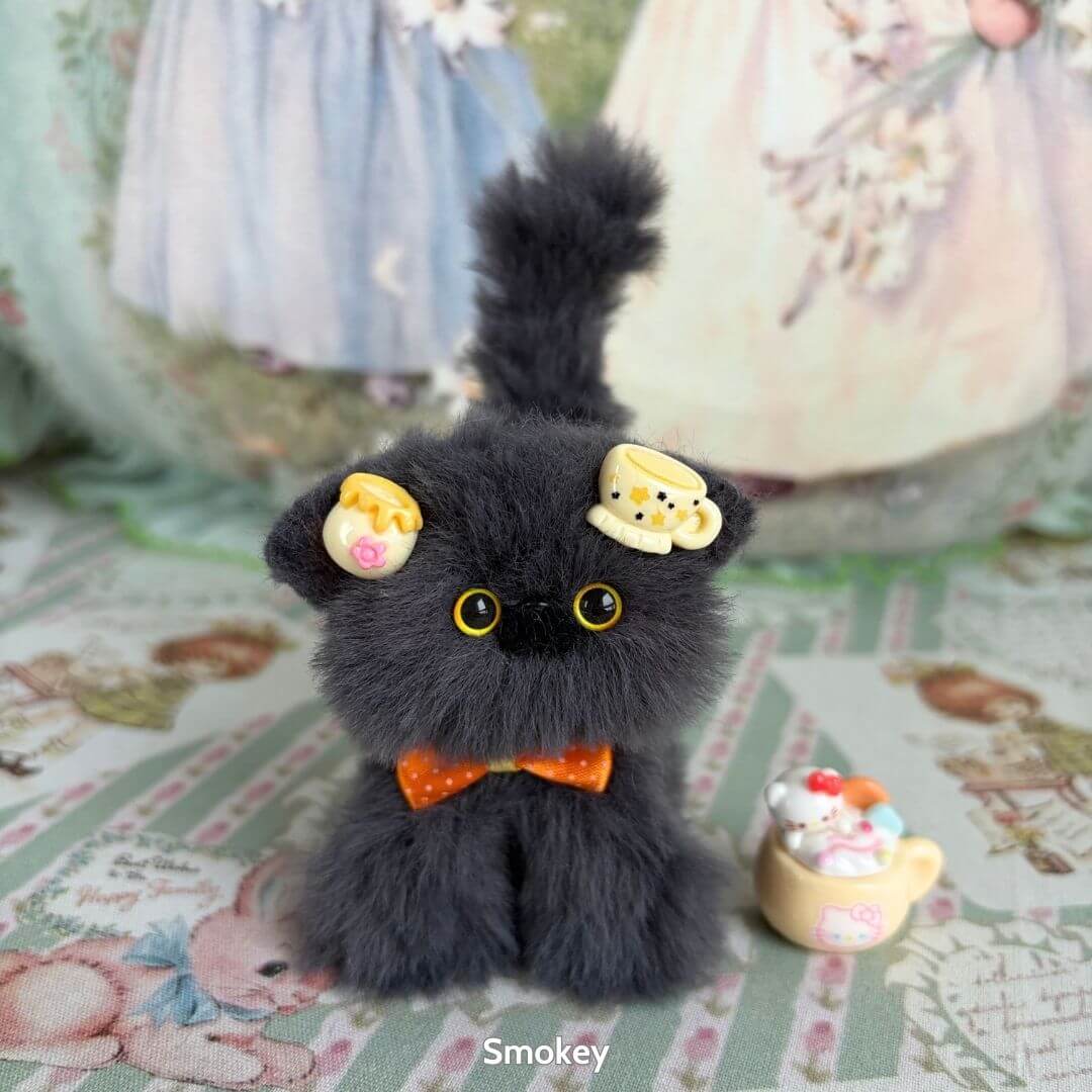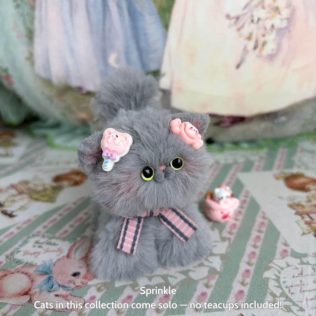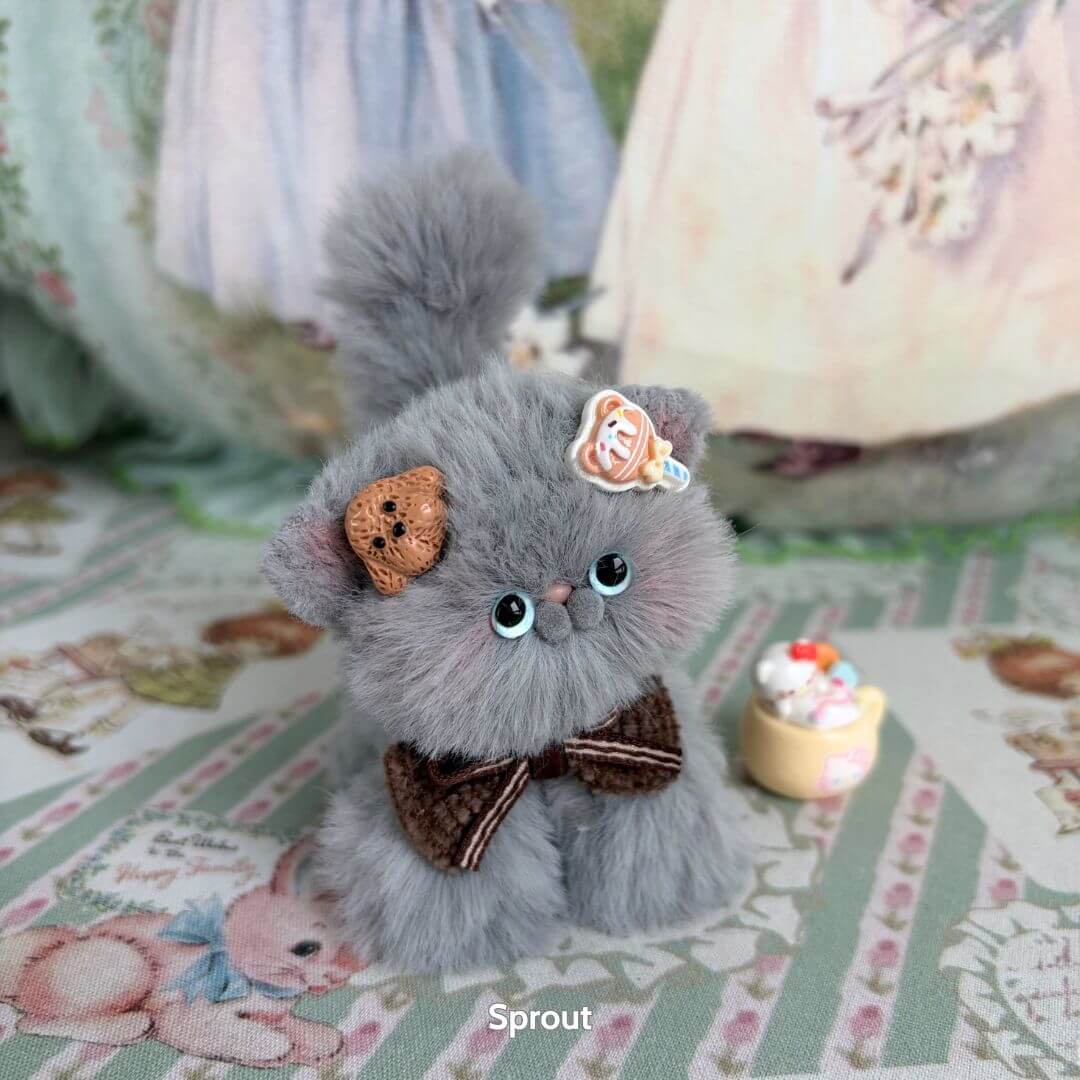 The Grey Kitten Collection celebrates the quiet magic of grey. From soft dove to stormy charcoal, each handmade kitten features a unique shade of grey faux fur — paired with whimsical accessories like strawberry berets, Halloween bows, candy hats or tiny cupcakes.