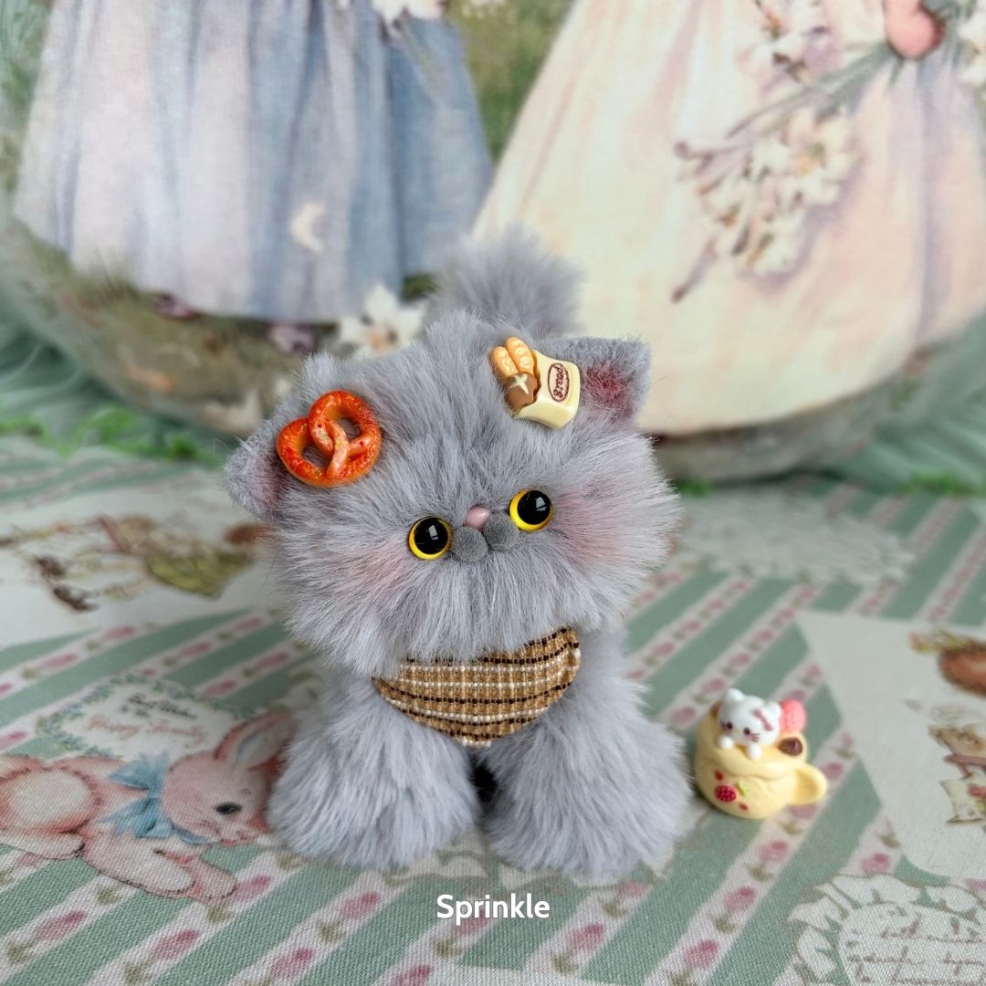 The Grey Kitten Collection celebrates the quiet magic of grey. From soft dove to stormy charcoal, each handmade kitten features a unique shade of grey faux fur — paired with whimsical accessories like strawberry berets, Halloween bows, candy hats or tiny cupcakes.